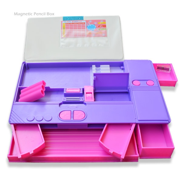 همچنین با فشردن دکمه های تعبیه شده در یک سمت از این جامدادی بزرگ و جادار، قسمت هایی از جامدادی باز می شود که می توان درون آن انواع پاک کن و مداد تراش را قرار داد.
